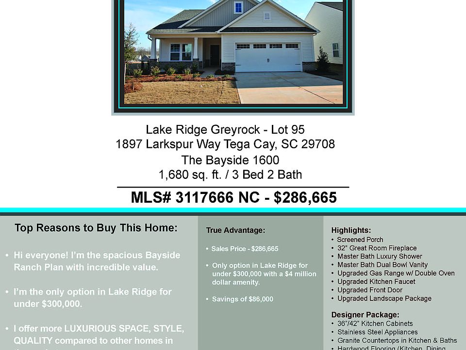 Brand new ranch home in active adult community called Lakeridge Grayrock in beautiful Tega Cay, SC. Access to beautiful amenity center with huge clubhouse, pool, tennis & basketball courts, 24/7 gym, etc. HOA dues also include lawn mowing.