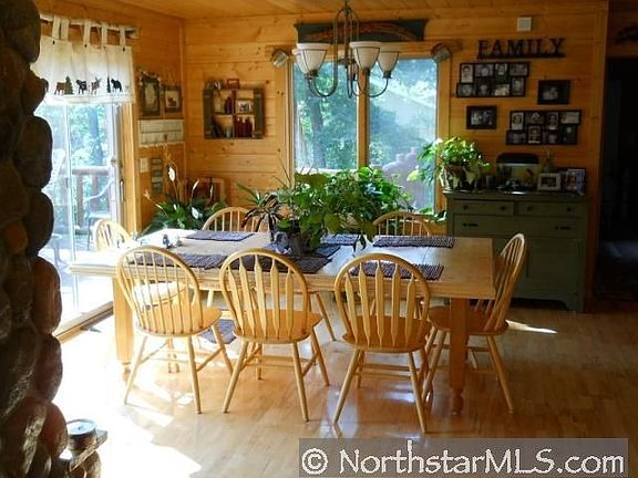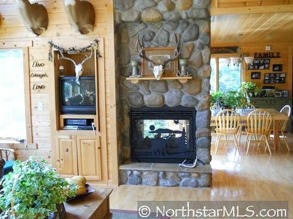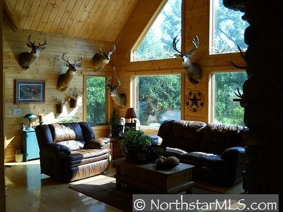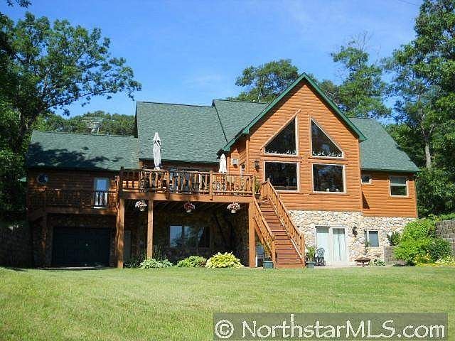 Executive Log lake home. Wall to wall windows displaying the glistening water of Big Lake. 4BD 4BA. Hardwood, stone fireplace, vaulted ceilings. Cozy home awaits you!
