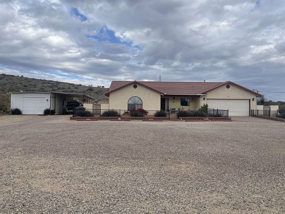 This beautiful 2-bedroom home with vaulted ceilings sits on five acres of country living in the city limits with city water. Enjoy the breathtaking views of the Pinal mountains through the kitchen window. This open floor plan includes a den with a Murphy bed for those extra guests. There are spacious bedrooms, a nice size laundry room and plenty of storage space. This home has solid wood interior doors and baseboards throughout. The Main Suite has a walk-in closet, walk in shower and access to the covered back patio. Bring your toys! There is plenty of room for parking - 2 car garage attached to the house and an 800 Sq Ft detached workshop with RV covered parking. You don't want to miss out on this great location! Call for an appointment today!