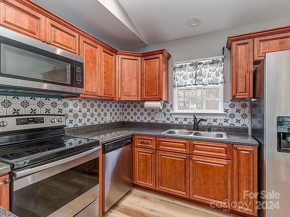 Welcome home to this like new move-in ready 4 bed 2 bath ranch with rocking chair front porch! Great kitchen with SS, lovely cabinets, backsplash, tons of storage and work space, open to dedicated dining space and large living area with cathedral ceiling.