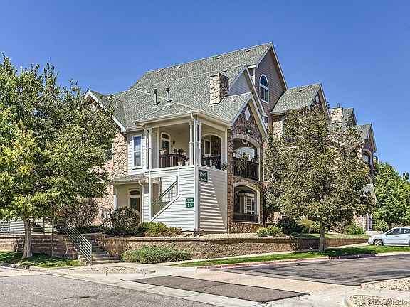 Presenting a bright end-unit in The Villas at Aspen Ridge community! This 2-bedroom, 2-bathroom condo offers an open floor plan, a balcony, and an oversized drywalled 1-car detached garage with shelving and a workbench. Step inside to discover new luxury vinyl flooring and a spacious laundry room/mechanical room. The open-concept kitchen flows into the living area with a cozy fireplace, built-in shelving, and dining space. The primary bedroom has a private en-suite bathroom and a walk-in closet, while the second bedroom connects to the second full bathroom. That is 2 separate primary bedrooms with no adjoining walls. For outdoor lovers, a private balcony is perfect for grilling and relaxing. The well-maintained community features a lovely pool. Conveniently located near schools, shopping, parks, trails, Denver International Airport (DIA), and just a short 5-mile commute to Buckley Air Force Base. Explore the comfort of this ground-floor unit in The Villas at Aspen Ridge.