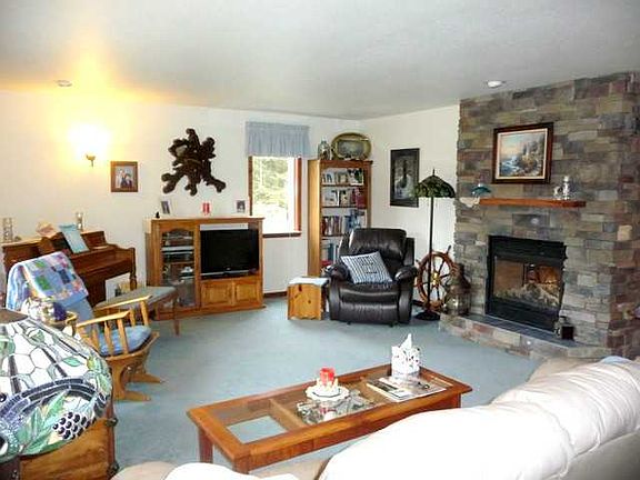 Custom Built 1 sty on 5 acres in mint condition. 24 x 26 attch garage + 40 x 48 heated garage w/ 8 ft dr & 9 ft ceil w/ half bth & sep fin rm. LV Rm w/2 sided stone fplc to the Lg Eat-in Kit w/appl. Lots of cab & counter space w/brkfst bar. 2 bd up, mstr w/gleaming hrdwd, walk-in closet & private bth. 3rd bd dwn w/egress & full bth. Full bsmt. Covered Patio, Shed, Tri-County Elec!