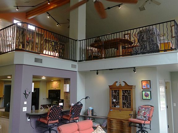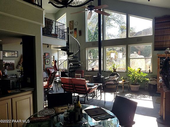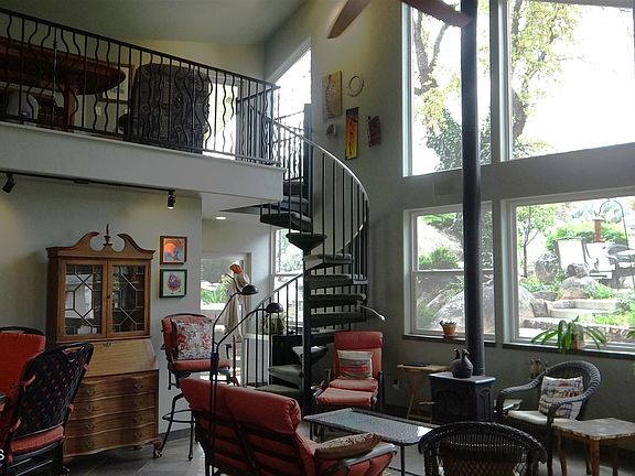 Truly a unique property on 1+ acres in city limits with it's own private 'boulder park' backyard featuring a hilltop deck with 360 * panoramic views, walking paths, patios, and a hot tub. All rooms are on the main floor except for large loft/family room. Master bedroom and bath, great room and upstairs loft/family room were added/remodeled in 2008. Great room features huge wall of windows to enjoy the beauty of the boulders and trees. Fireplaces in living room and dining area plus a wood-burning stove in great room. Many built-ins T/O. Two detached garage/workshop buildings: 768 sq ft has cooler and 1008 sq ft is heated and cooled. Lots of room for parking an RV and other vehicles. Solar system is completely paid for and saves money. 1/4 mile of paths run through the boulders.