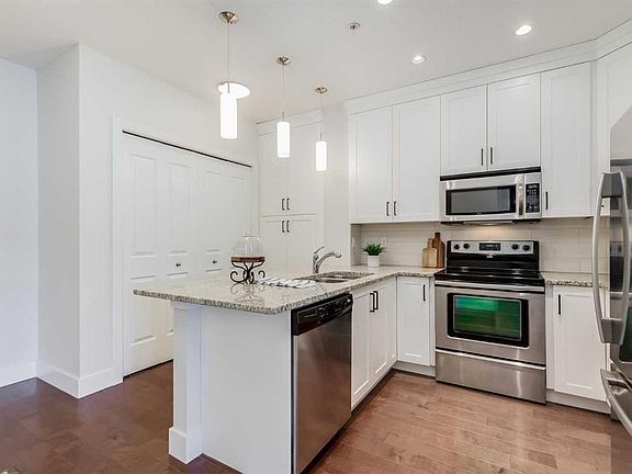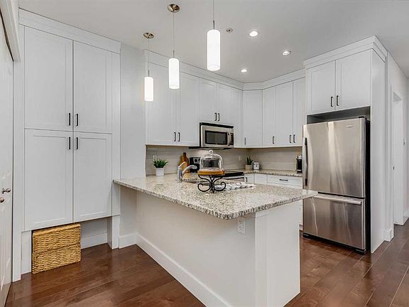 Warm inviting layoutRich hardwood flooringNine-foot ceilingsRenovated kitchenFull-height white cabinetryGranite countertopsStainless steel appliances