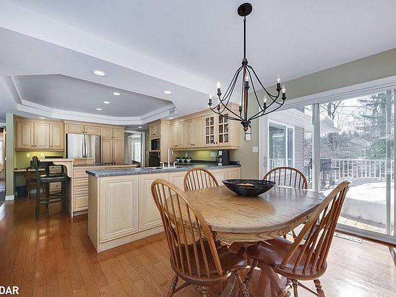 Elegant 2 storey detached home set on 1.7 treed acres in desirable Marchmont, Orillia. Poised for privacy on Warren Court and backing onto the North River. Generous wraparound front porch with new railing. Double front door opens to spacious tiled foyer. Sophisticated living and dining rooms connect by hardwood. Bright, eat-in kitchen with sliding door to back deck. Large centre island with sleek built-in cooktop. Kitchen and family room with statement coffered ceilings. Family room perfect for cooler months with natural gas fireplace. Convenient main floor laundry and 2pc bathroom. Unobtrusive pot lights throughout. View of trees from every window. Flooded with natural light. Second floor boasts four bedrooms. Spacious Primary has views of the North River. Features recently updated 5pc ensuite with granite countertops. Partially finished basement with carpeted recreation room and gas fireplace. Also includes built-in shelving, utility room and rough-in for bathroom. Back deck overlooks property filled with greenery, gardens and wildlife. Perks: electrical wired for hot tub, gas line for BBQ, river access.