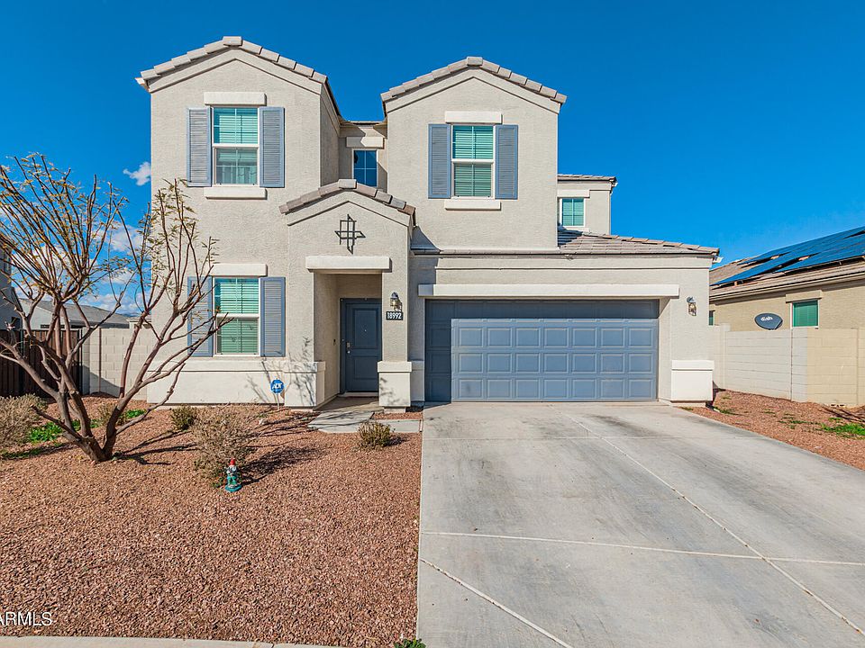 Welcome home! Modern, energy-efficient living in this stunning 4-bed, 2.5-bath residence w/ solar panels! 1st floor main bedroom & bath, recessed lighting, and chic wood-look flooring. The great room boasts soaring ceilings and sliding doors leading to the backyard. The kitchen features granite counters, sleek shaker cabinets, SS appliances, a convenient pantry, and an island with a breakfast bar. Upstairs, you'll find a cozy loft and plush carpeting throughout. The main bedroom offers a private bathroom with dual sinks and a walk-in closet. Unwind after a long day in the backyard, complete with a covered patio and ample space to create your dream oasis. This value won't disappoint! VA Assumable loan at 2.5%