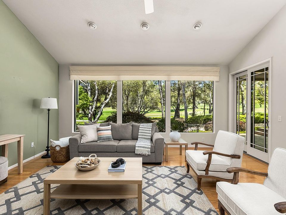 This stunning home is on the 7th fairway, on one of the most sought after streets in the community, and offers big golf course views and a level lot. Designed for entertaining and ideal for multi-gen living, this split level 3 bedroom, 2 full bath and 2 half bath home blends comfort and convenience. Behind the gated front entry and lush landscaping, step into a bright and welcoming interior featuring a living room with a floor-to-ceiling stone fireplace, big picture windows, a formal dining room, and a large chef's kitchen with an island and breakfast nook. A slider opens to a covered patio, perfect for morning coffee or evening gatherings. The main level also includes a guest bedroom with full bath, a convenient half bath, laundry room, and garage. A few steps up, retreat to the primary suite with 2 closets and a bath with a walk-in shower. Head downstairs to an expansive flex space ideal for guests or entertaining, with a separate living area, private bedroom with built-ins, half bath, ample storage, and a dedicated golf cart garage. The outdoor space is a show stopper - custom concrete patios and walkways lead to a tranquil pond, creating your own private oasis. Lake Wildwood is an all ages, gated community, 1 hr to Tahoe or Sac, 24 hour security, lake, pickleball and more!
