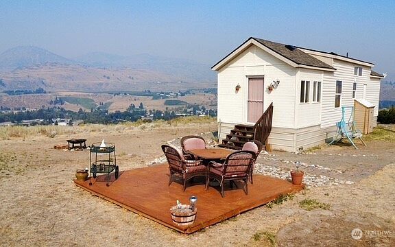 PRICE REDUCED! SPECTACULAR VALLEY VIEWS from this cozy TINY HOUSE only 5 minutes from Okanogan on 12+ acres. Approx 576 sf including loft. 1 bed/1 full bath, living rm with built-in desk, dining area, kitchen with appliances. 2nd bedrm possible in loft. Utility area in bathroom w/stack-able W/D. 2 storage sheds, partially fenced, relaxing wood patio/deck area with views overlooking the valley. Community water system, septic. Front porch has been finished into additional living space. Low maintenance landscaping. $219,900 H-3708/MLS2426452
