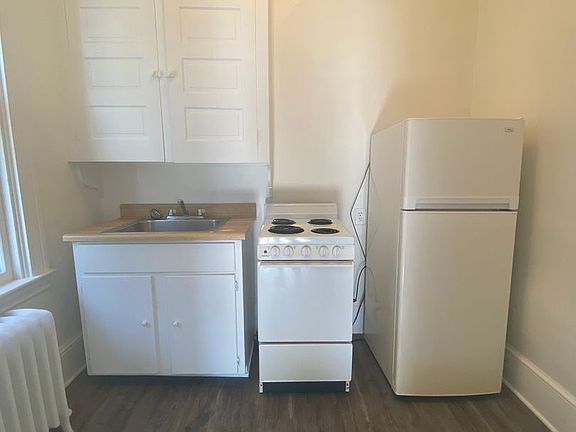 This first floor apartment features an open living/bedroom area with new plank flooring, high ceilings two oversized windows for natural lighting and includes an electric range and refrigerator in kitchen area with shelves and cabinet space. A Beautiful Bathroom that has a standing shower stall, vanity sink, light fixtures and toilet.