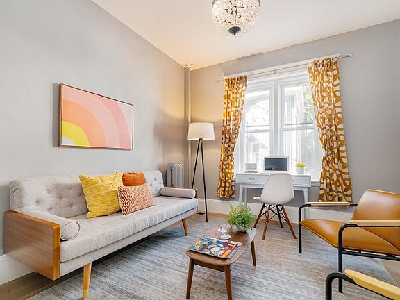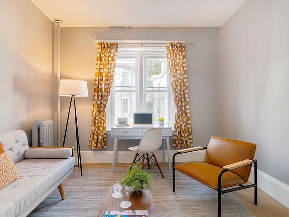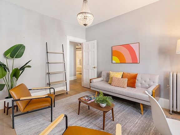 This sun-filled first floor 1-bedroom offers the perfect combination of style, space, & convenience. The entry foyer, with its chevron accented wall & modern wide-plank flooring, welcomes you into a layout that flows seamlessly into the living room & bedroom. The recently updated eat-in kitchen is a standout, featuring white shaker cabinets, stainless steel appliances, gas cooking, and ample cabinet & counter space. Large enough for a dining table, it is ideal for both casual meals & entertaining. High ceilings & elegant light fixtures give this condo a polished finish. In the bedroom, two windows overlook your private, covered back deck—perfect for relaxing in the fresh air. The stylishly renovated bathroom includes a glass-enclosed shower w/ classic subway tile and a recessed niche shelf for added functionality. This professionally managed building includes heat & hot water in the HOA fee, plus laundry & storage in the basement. Steps to public transit w/ quick access to I-90.