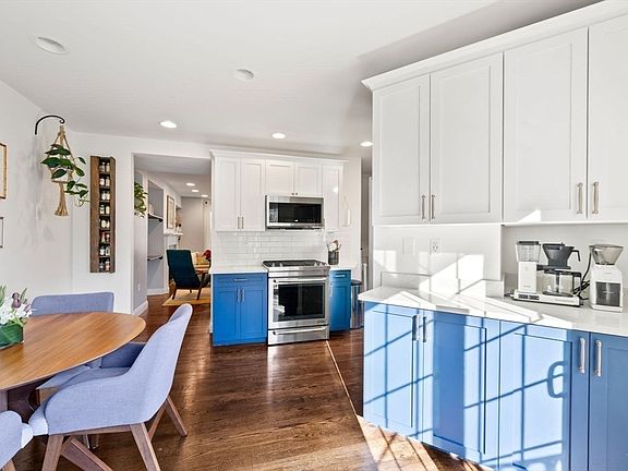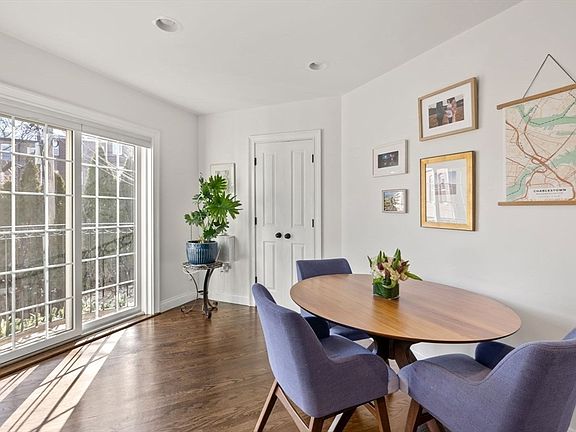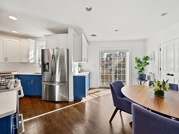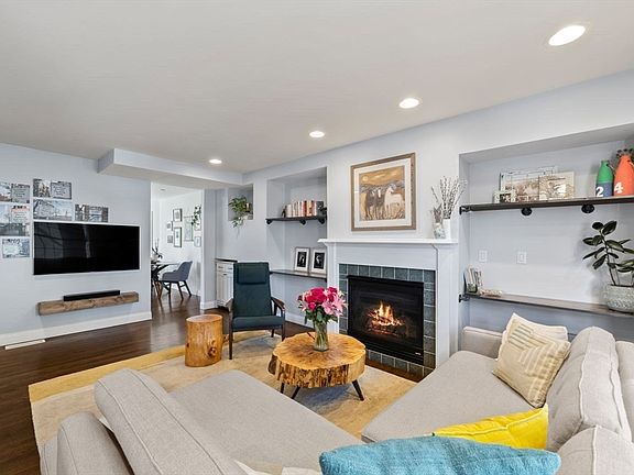 This bright and spacious 2BR/1.5BA, separate entrance townhome lives like a single-family home and comes with a coveted private garage. Enter into a spacious mudroom with ample storage space, coat hooks, bike hangers, a half bathroom, and laundry center. The second level features a recently updated eat-in kitchen with vibrant blue cabinetry w/white uppers, tile backsplash, stainless steel appliances, quartz countertops and pantry closet. A quaint coffee bar is located near French sliders opening to a Juliette balcony w/planters, bringing incredible sunlight to the space. The beautiful living area features a gas fireplace, built-in shelving, large bay window and an office nook. The upper level has two oversized bedrooms and full bathroom with tiled tub/shower and granite topped vanity. The primary bedroom includes a bay window and customized walk-in closet. The oversized second bedroom has a double closet. Amenities: central air, private garage w/EV charger, shared guest parking spot.