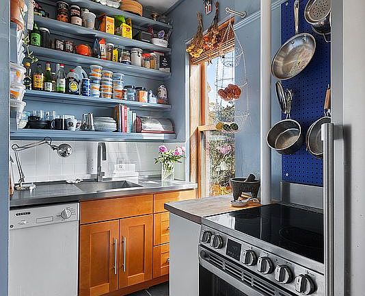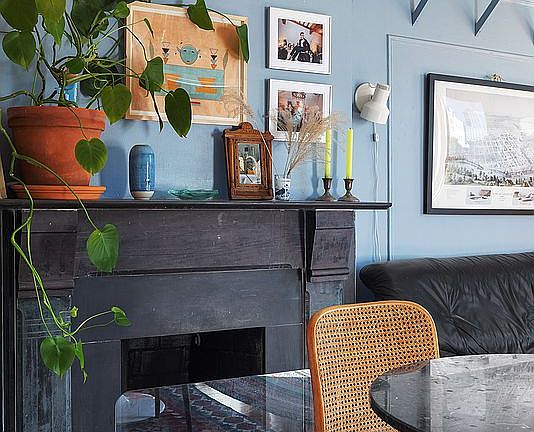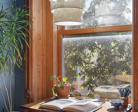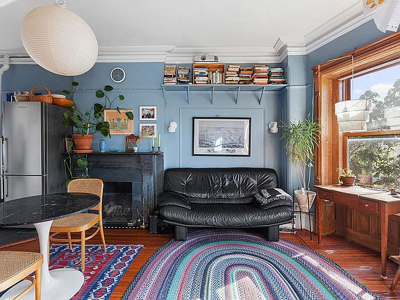 The home features original details including a soapstone mantel over a wood-burning fireplace, 9-foot ceilings, picture-frame and crown moldings, stunning hardwood floors, and large, wood-framed windows. Storage abounds with built-in shelving and cabinetry throughout. The kitchen was redesigned in 2022 with thoughtful details including a custom stainless steel counter that includes an extra-large sink. The sun-filled space also features bespoke wraparound shelving, maple cabinets, a Blomberg refrigerator, a glass top Haier electric stove and oven, and a dishwasher. In the bathroom, you’ll find wall-to-wall cabinets, a pedestal sink, and a porcelain bathtub.