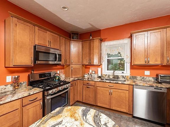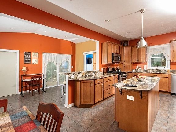 - Kit Dscrp: Countertops - Stone/Granite/Solid, Flooring - Stone/Ceramic Tile, Breakfast Bar / Nook, Kitchen Island, Stainless Steel Appliances, Remodeled, Exterior Access, Gas Stove, Peninsula