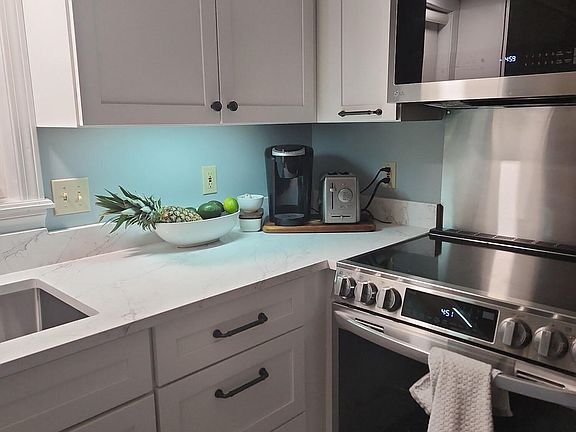 The first floor features a newly renovated kitchen with stainless steel appliances, quartz countertops, tile flooring, and an eat-in area that opens via sliders to a spacious deck—perfect for entertaining. You'll also find a first-floor bedroom, full bath with new vanity, laundry area, and a comfortable living room equipped with mini-splits for efficient heating and cooling.