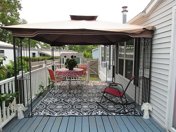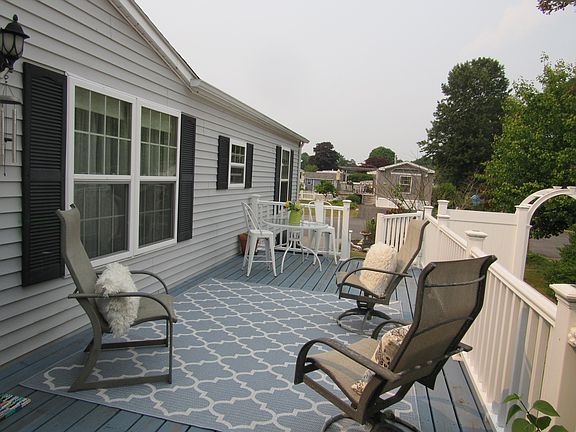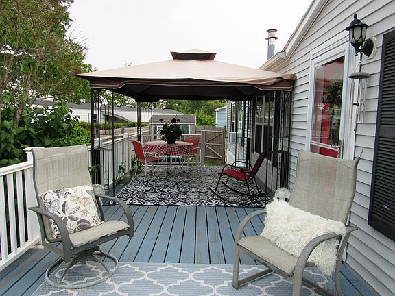 Coastal Charm, this renovated sunlit home is perfect for year round or part time living. Located near the end of the street in this lovely 55+ community, you will enjoy the oversize deck that lends itself to wonderful outdoor space perfect for entertaining or relaxing. Small portion of the yard is fenced convenient for any dog lover. Spacious skylit eat in kitchen has all appliances, 6 burner natural gas cooking and opens to a living room with a gas fireplace with Spanish tile and large windows overlooking the private deck. Primary bedroom has a walk-in closet and a full bath. Gorgeous LLC Vinyl flooring throughout. Nice attention to detail & decorators touch with beautiful chandeliers and tastefully done. The laundry room with washer & dryer and large closet is conveniently located off of the hallway. Comfortable second bedroom has large closet & bead board ceiling. Second bathroom is beautifully renovated. Close to shopping & great restaurants. Nearby to Onset Beach & Cape Cod Canal.