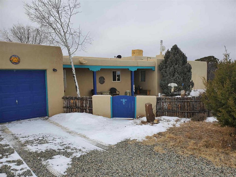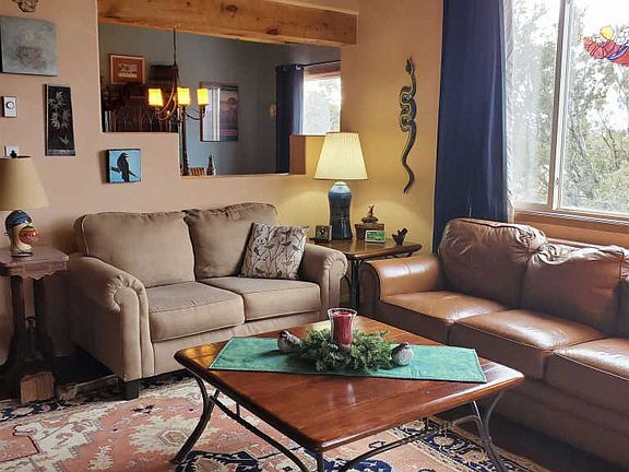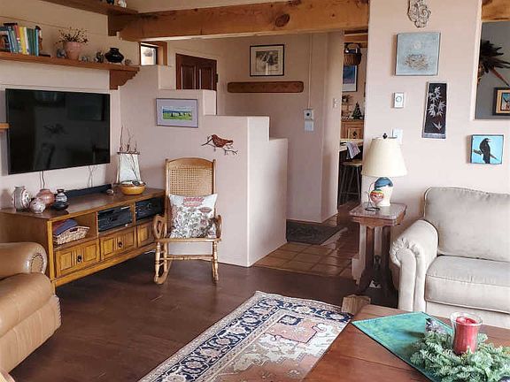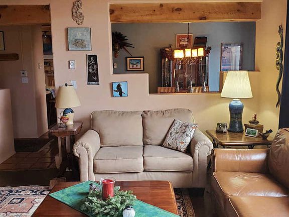Charming Eldorado home with mountain views on 1.5 acres and backing into a greenbelt. Comfortable floorplan with owners' suite separated from guest rooms. Wood ceilings with vigas in main living areas. Kitchen and baths have been updated. Hardwood and satillo tile floors throughout. Natural gas cooking and natural gas Vermont Castings stove with thermostatic control in living room. Passive solar design coupled with energy efficient active solar system to power electric baseboard heat. Newer energy efficient windows. New silicone membrane roof in 2016 with 10 year transferrable warranty. Fully fenced yard. Drip irrigation system with new pump. 10 x 12 workshop/studio for the artist or craftsman. Eldorado offers a community center, pool and miles of walking trails for easy family living.