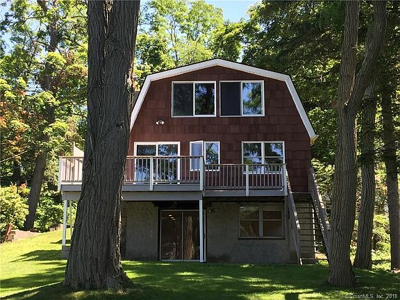 Every sunset is yours from this cozy cottage with direct waterfront on Ball Pond. Gorgeous west exposure, level yard at the waterfront and close to the NY line, look no more! The main level features an eat-in-kitchen and opens to the living room with brick fireplace and wood burning stove with sliders to a spacious deck overlooking the water. A full hall bath, also accessible from the master bedroom which overlooks the pond, and a second bedroom complete the first floor. The lower level is where you will find the third bedroom, full bath and spacious family room with brick fireplace and wood burning stove and sliders to the ground level patio overlooking Ball Pond. The full size unfinished attic offers incredible views of Ball Pond and lots of finished space for you to create your dream master bedroom, etc. Two car garage with above-ground oil tank and heating system, parking space at the road and driveway space all add up to extra convenience at this waterfront retreat.