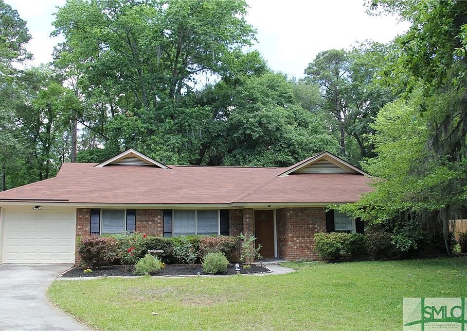 Fantastic all brick home nestled on a oak tree shaded, corner lot in Kings Grant Subdivision. Ranch style home with covered closed in patio, waiting for you to enjoy the large private fenced backyard and an oversized bench swing. Single garage and outdoor shed for all of your storage needs. The fully equipped kitchen features black appliances, new stove, wood cabinetry & a casual dining area overlooking the large backyard. Laminate flooring throughout the house and into the paneled den that boasts a vaulted, beamed ceiling with fan, brick hearth fireplace and entry to the large closed-in patio. Both bathrooms feature neutral tile. Master has a separate shower. There is a large laundry room w/washer/dryer hook-ups, shelving and exterior doors to the backyard and garage. Walk to shopping and school. Sidewalk and streetlights. Easy commute to Hunter, Fort Stewart, Gulfstream, Savannah Ports and Airport.