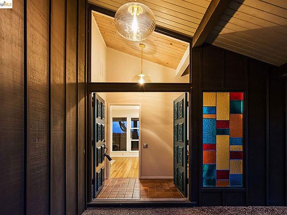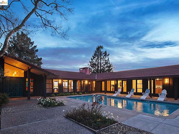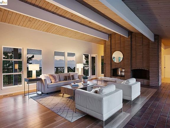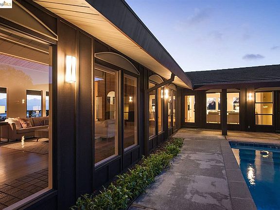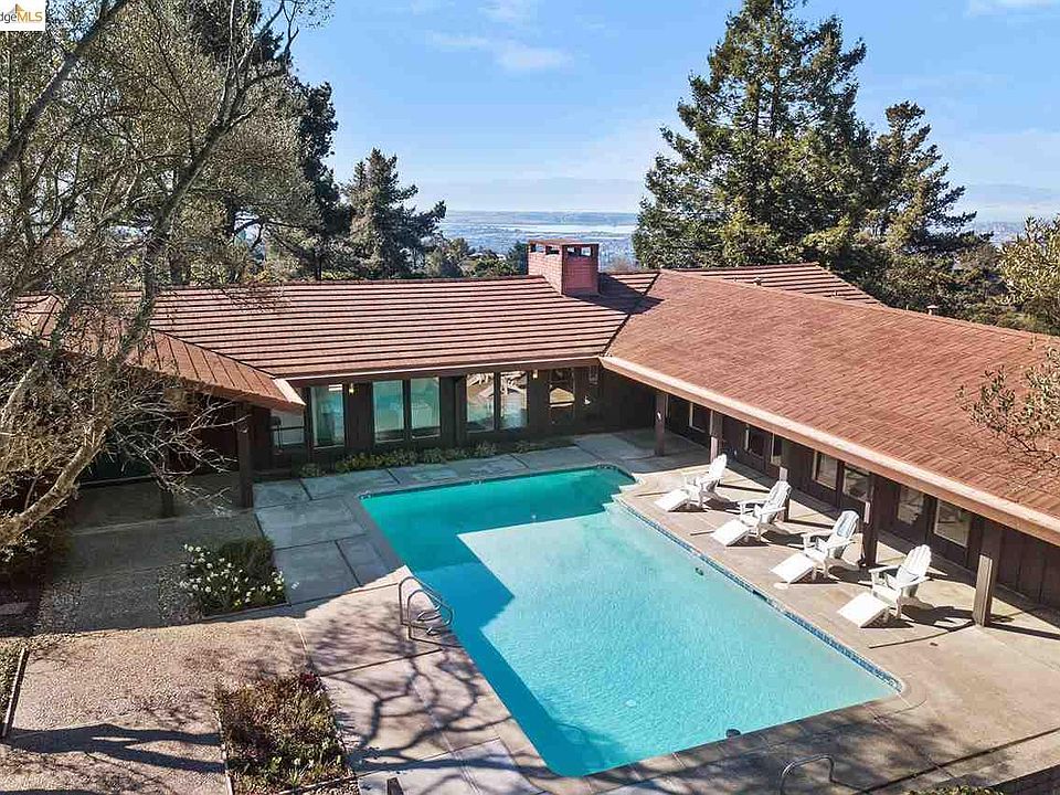 Sizzling mid-century with soaring bay views. Resort-like pool and front patio. Walls of windows bring the outdoors in. A rear deck spans the width of the home from which to take in views of the bay. Level living with vaulted ceilings and iconic detail; gleaming wood floors; two-way fireplace. Family room, office, and extras. The acre parcel stretches far below the back patio, offering marvelous privacy and the opportunity for those with a love of the outdoors to make it their own.