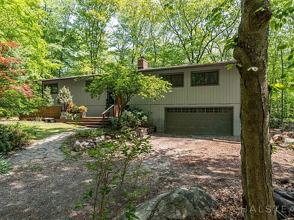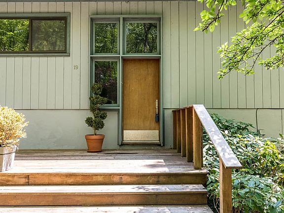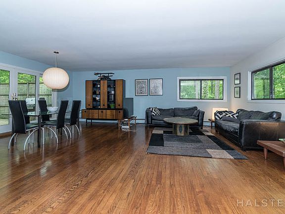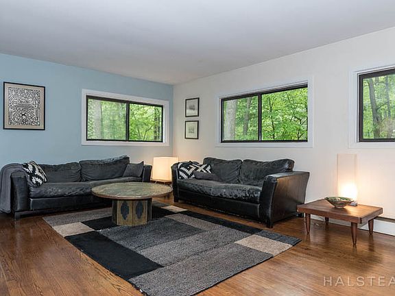 Mid-century modern design with beautiful hardwood floors .Huge lightfilled livingroom/brick fireplace/dining room/sliding doors to deck. 3 beds/3 full bath plus 4th bedroom/office/artist studio. Contemporary kitchen mid century design with natural gas. Light/bright lower level with walk out to porch. Lightly wooded lot with mature plantings. MOST IMPORTANT DO NO LET CAT OUT