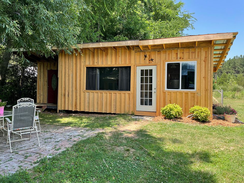 Hello nature lovers: Unique Tiny House. Comfy. Fully Furnished. Queen Bed. All Appliances. Washer/Dryer. Nice Screened Porch overlooking fields of wildflowers. Located 5 miles outside Pittsboro on 64-acres in well-established Blue Heron Farm community. Organic garden space available. Hiking trails and ponds. Gas grill. 10 minutes to Pittsboro, 25 minutes to Chapel Hill. Serene, beautiful views, good neighbors. $825/month includes utilities & internet. 1 month deposit. Rent includes utilities and internet. Washer/dryer in main house. No smoking. Free parking. Quiet community. Hiking trails and ponds. Organic garden space available.