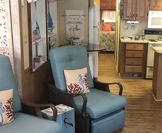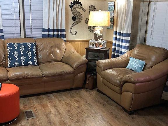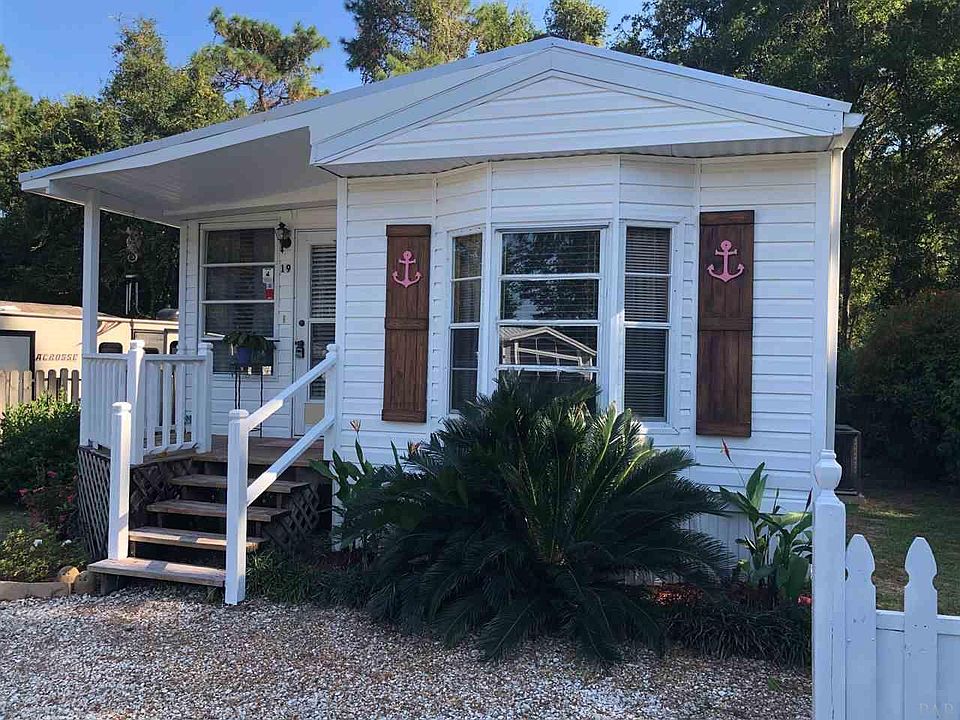 Must See. This won't last long and is move in ready. This is clean and beautifully decorated with a beach style. This, one bedroom, one bath park model comes completely furnished. There is an enclosed Bama Room with 2 day beds for relaxing or for overnight guests. This property has a screened side porch and covered front and back porch with a private shaded sitting area in the back yard. The utility shed is 8 x 19 that houses the washer and dryer. There are 3 spots for parking. A new air conditioner and heater were newly added, new floors and new metal roof were recently added. Enjoy the amenities of Spanish Cove...Pool, clubhouse, tennis courts, fishing pier with beach and 24 hour security. One time buy-in transfer fee of $600.00. Price includes all furnishings. Come see your new home. This gem will go fast.
