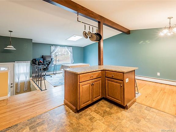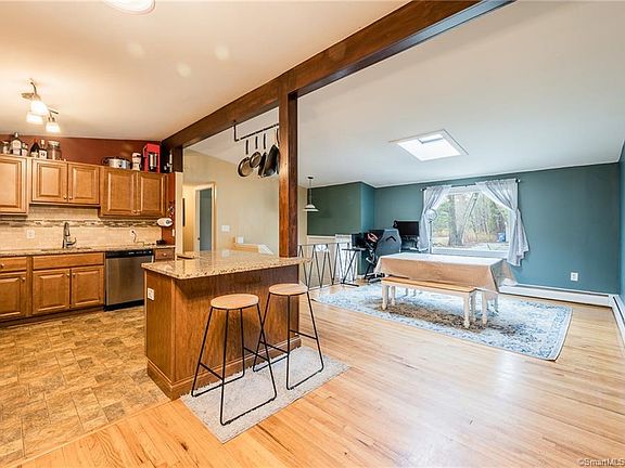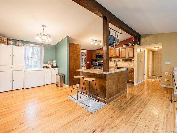 Make this house your new home! Warm & welcoming raised ranch in the lovely Highlands neighborhood of Ledyard. Open concept kitchen with an L shaped breakfast bar overlooking the living room & dining room. Gleaming hardwood floors throughout. Main level primary bedroom has its own spacious half bathroom. Lower level comes complete with a large family/playroom/den, another half bath, and a laundry room. The fourth & largest bedroom is in the lower level. Kitchen leads out to deck overlooking the back yard. House has been fully renovated in the past 6 years. Nothing to do but move in & put your own touch on!!