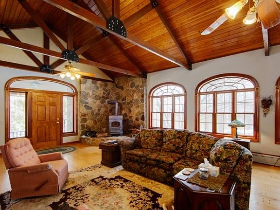 Beautifully expanded home w stunning great room w vaulted ceiling, wall of windows and woodstove w fielstone fireplace. cherry kitchen w Pella doors to deck pool, master bedroom w private bath, walk-in closet, home office library w gas fireplace, fieldstone fireplace in dining room. pegged hardwood floors, Pella windows , inground cement pool w recent cover, basement w small party kitchen, oversized 2 car garage under, square footage from tax records, buyer to verify. Original home built in 1958 1962. Two seamless additions. beautiful private setting yet convenient to town. rear yard fenced. Block 101, lot 12 , 44 acres , adjoining this property is owned by Chester Boro, acquired with green acres funding . Dining rm fireplace has not been used in many years will be conveyed as is