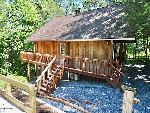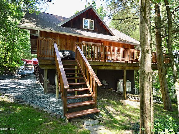 Located in the small community of Tuscarora Village, this cedar chalet has 3 bedrooms, 2 full bathrooms and sits amongst the trees. The home is located just minutes to I80. Enjoy the HOA benefits such as river access for your boat or swimming, the use of tennis courts and pool. The first floor has a large bedroom and full bathroom. The kitchen has been updated with pine cabinets and is open to the dining room. The living room is cozy with a brick wood burning fireplace. The second floor has an half bath and two more bedrooms, one with a balcony. The lower level has a recreational room, utility room with laundry and 1 car garage. There is wrap around deck that overlooks the manicured back yard and has views of the Delaware River in the fall and winter.