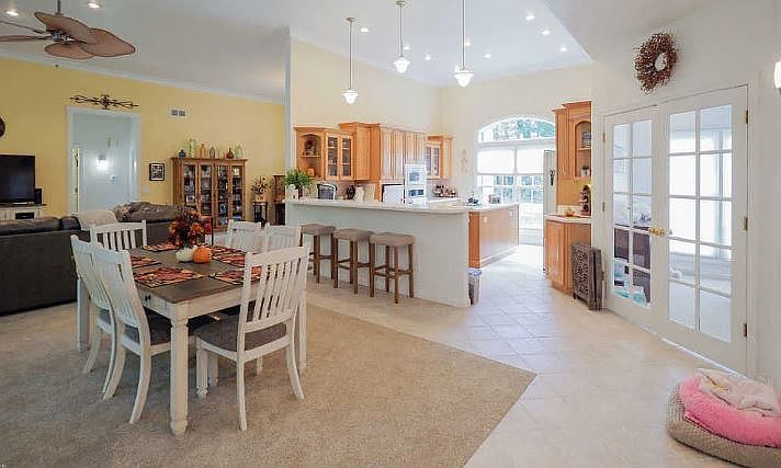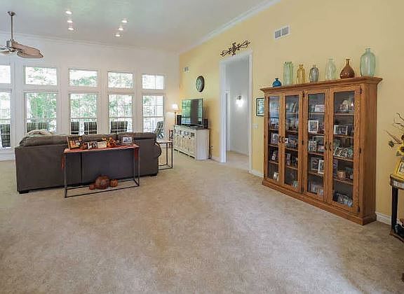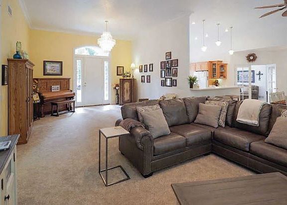 This light and airy 3-bedroom ranch welcomes you with a stunning entry featuring a chandelier and 12-foot-high ceilings throughout the open floor plan. The large living room is perfect for entertaining, while the dining room, with wall-to-wall windows overlooking mature woods and plush carpeting, creates a warm, inviting atmosphere. The roomy kitchen boasts hickory cabinets, Corian countertops, ceramic floors, a desk area, and a pantry ideal for meal prep and organization. Enjoy your morning coffee in the cozy sitting area adjacent to the kitchen. The laundry room includes a laundry sink, counters for folding, and ceramic flooring for convenience. The master bedroom features high cathedral ceilings, a ceiling fan with light, and an attached master bath with a Jacuzzi tub, ceramic floors, two sinks with a granite countertop, and a walk-in closet. Additional bedrooms have double closets, providing ample storage. The property also offers a 3-car garage, an unfinished basement, and a large porch overlooking a spacious backyard with scenic views of the woods. A shed with a wood floor completes this lovely outdoor space