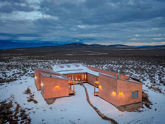 Custom & New Built High Desert Hacienda ~ Welcome to 19 Cielo Grande, a distinctive modern interpretation of a classic Hacienda on a majestic high-desert setting near Taos. The 20 acres surrounding the residence offer some of the most extravagant 360 views in all of the Southwest, with plenty of privacy surrounding. The sustainable and top-quality materials that make up this overbuilt 2x8 frame home are truly impressive. Premium clear heart redwood cedar French doors within a vast living space perfect for gathering, relaxing, and soaking in sunrises over the Sangre de Cristo mountains. The floors of the residence consist of Eastern white pine planks and charcoal porcelain indoors, and redwood decking outside on the wrap-around Hacienda deck guaranteed to last for decades. The custom true Douglas Fir black pipe industrial design kitchen is a culinary delight and boasts beach butcher block countertops, a granite island, abundant cabinetry, a 12-light chandelier, reverse osmosis drinking water, and efficient appliances. The vaulted ceilings in this area add to the grandeur of it all, and continues into the enormous primary bedroom and bathroom with a soaking tub, double vanity, shower boxes with custom shelving, and a walk-in closet. On the same wing of the home you will find the library, or perhaps a detached office, maybe a guest room. On the opposite wing you will find an oversized utility room with a Maytag washer and dryer, a sizable guest bedroom, and the office which can also be utilized as a fourth sleeping space. Extra sunlight enters the home through eleven (11) polycarbonate skylights that keep the space nice and bright, backed up by the elegant light fixtures powered by a three 16-panel solar array. At the exterior of the home you will find a 5K gallon rain catchment within a custom built pool-lined cistern housing. The 3,600 sqft white cedar shake shield roof with propanel will keep the home nice n dry, blue lapses window sills to match the vast NM skies, and the landscape surrounding is a blank canvas. Come explore this high-desert Hacienda which is the perfect blend of quality, comfort, and CUSTOM elegance.