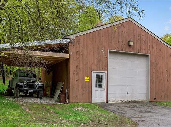 This property offers a 2 family house (one apartment completely renovated), a detached 3 car heated garage and attached carport, and a large storage shed/workshop, on 3+ private acres. Opportunity for small business operation and/or income from apartment rental.
