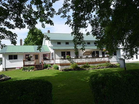 This is the life! You will have everything you need and more on this beautiful property on over 16 acres of land. This large farmhouse offers 5 bdrms and 1 bath w/ an add'l Mother-in-Law suite w/ their own bedroom, bath, kitchen and living room! New replacement windows and wood stove for heat. Views surround you on all sides, as the outdoors features a large barn, pasture w/white picket fence, large garden & big pond with deck. Also enjoy your own workshop, 2 car garage, storage buildings and large patio deck, too. Sit in your covered porch to take in the beautiful nature that surrounds you!!