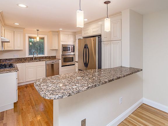 If you need a four bedroom, three and a half bath Colonial with either a separate in-law, kid-law or in-home office space you should see this house! Curbside look can be deceiving as this brick Colonial, renovated top to bottom, has first floor with a large LR open floor plan, floating custom stairs with a fireplace, dining room, updated gourmet kitchen with stainless commercial appliances and granite counters and 1st floor bedroom for guests. Gleaming hardwood floors; The large master suite (2 rooms) has a tiled master bathroom with a separate shower and stand alone soaking tub. Two more bedrooms and a full bath are on the second level. The basement has 3 finished rooms with a fireplace and a spa like full bath. Access to the garage and a separate private entrance out. Updated 3 zone gas heat. 72 gallon gas hot water tank. 100 amp electric with cb's.The yard is fenced-in w/ mature plantings, fire pit and patio - a pleasant private space. Easy highway access/ Legacy Place