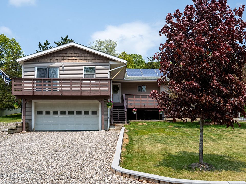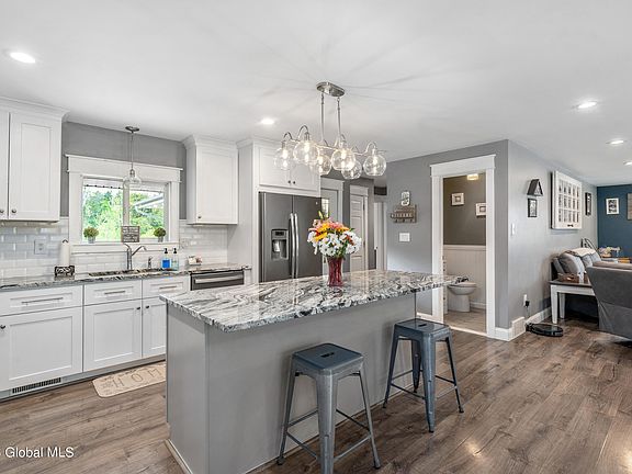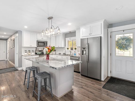 Welcome to this stunning 5 bedroom 3 bath house situated on a beautiful 5.83-acre lot in the desirable town of Schodack, NY. This spacious and well-maintained home offers plenty of room for any family, and to entertain guests. The main level features an open concept with kitchen, dining area and the living room which provides ample space for hosting dinner parties & holidays. The updated kitchen boasts stainless steel appliances, granite countertops, and plenty of cabinet space w/ large island. On the same level, you will find a primary suite with a private bath and walk out balcony. The lower level features a large family room, laundry room is also located on this level as well as access to the attached garage. Enjoy the beautiful outdoors from the large deck. East Greenbush Schools.