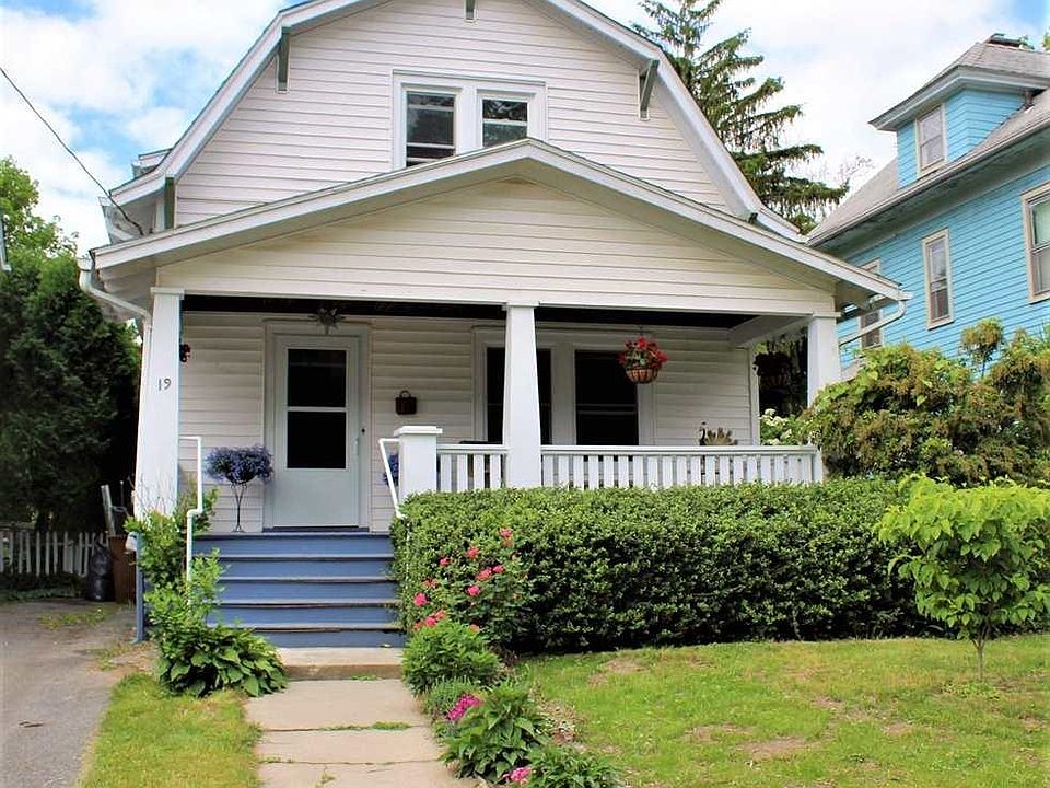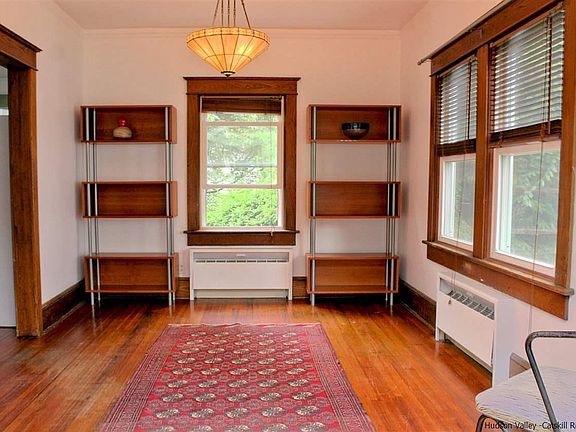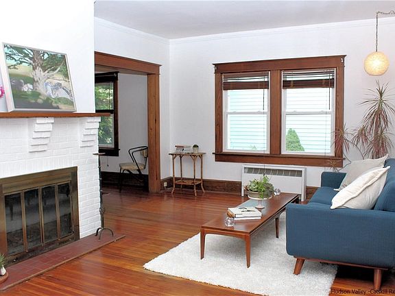 This sweet solid home circa 1928 is on a quiet block walking distance to desirable uptown Kingston's stockade district. There is a covered porch, hardwood floors, untouched oak crown molding and leaded glass front door. This house has great flow and light plus off street parking that leads to a semi private backyard. Cute 247 sq ft outbuilding, currently used a shed, was most likely the original one car garage. The roof is approx 3 years new, there is a high efficiency gas boiler, and the line to municipal water was recently replaced. Good closet space and full dry basement for storage. The owner is sad to leave this low maintenance gem but had a life change and is moving cross country.