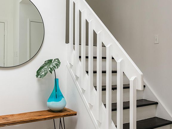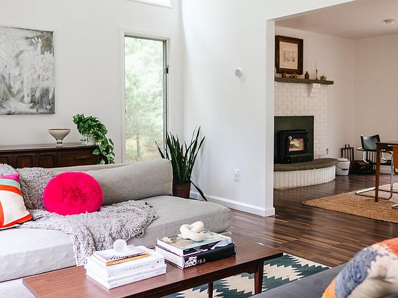 Enter through the double doors into the bright foyer. To your left, you'll step down to the living area with large windows and high ceilings. Enjoy the comfort of a spacious, open layout that seamlessly connects the living and dining areas with the kitchen, anchored by a cozy fireplace perfect for unwinding. The downstairs extra room is currently set up as a bedroom, but would also make a great office or den. Upstairs, the primary suite is accessed though unique double doors and features sky high ceilings with tons of natural light. Down the hall, two additional bedrooms and another extra room share a bathroom - all of which look out onto the canopy. With total privacy and an attached garage, this home offers the perfect balance of seclusion and convenience.
