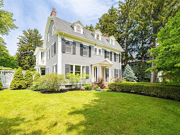 Welcome to one of Rochester’s most distinguished residences, ideally located in the heart of the city’s most desirable neighborhood. This impeccably maintained & elegantly updated home offers over 5,200 square feet of finished living space across three levels, blending timeless architectural charm with modern luxury. Step inside to discover rich original details including hardwood floors throughout, custom millwork, and intricate moldings that highlight the home’s classic character. The true chef's E/I kitchen is a standout, featuring high-end appliances, a massive center island, custom cabinetry, and a sunlit dining nook—perfect for everyday living and entertaining. The formal dining room impresses with warm wood tones and a beautiful, coffered ceiling, ideal for hosting memorable gatherings. Relax in the inviting living room with a gas fireplace, or retreat to the cozy den, complete w/built-in bookshelves. Upstairs, the luxurious primary suite offers a spa-inspired ensuite bath, walk-in closets, an attached sunroom, and peaceful views of the beautifully landscaped grounds. Multiple additional bedrooms, home office options, and guest accommodations ensure space and flexibility for all lifestyles. The 3rd-floor rec room w/pool table is a wonderful hangout for family game/movie night. The partially finished basement includes a spacious laundry room and ample storage. Outdoors, enjoy your own private oasis featuring a covered porch, heated gunite, saltwater IG pool w/stone deck, and a fully equipped pool house w/half bath + outdoor shower -perfect for hosting or relaxing in style. Meticulously designed gardens and a serene labyrinth complete the spectacular backyard setting. A detached 3-car garage, built in 2012, includes a second-floor space ideal for a studio, workshop, or future expansion. EV-ready w/wiring for a charger—just bring your own. All of this, just minutes from parks, restaurants, cafes, museums, URMC, I-490. This is a rare opportunity to own a refined, character-filled home in one of Rochester’s most sought-after locations. Updates inc. Furnace '25, (2) H2O '24 & much more! Del. showings to 6/11@noon & Del. neg to 6/16@noon.