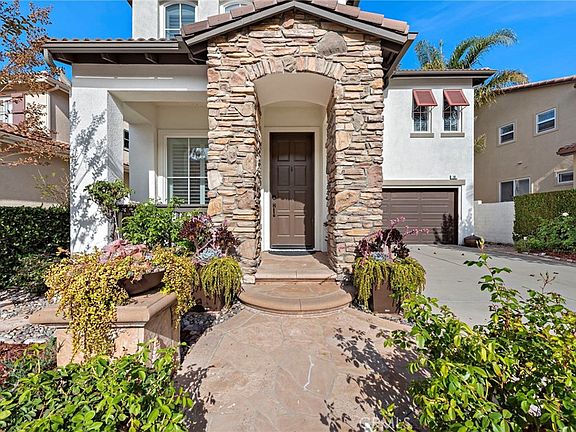 Welcome to this stunning home nestled in the highly sought-after Las Flores community of Rancho Santa Margarita. Boasting breathtaking panoramic views of the Saddleback Mountains, this 3-bedroom, 2.5-bathroom property spans just over 2,400 square feet and offers a harmonious blend of elegance and comfort. Upon entry, you’ll be greeted by soaring ceilings and hardwood flooring that flow seamlessly throughout the main level. Plantation shutters provide timeless charm and privacy, while brand-new carpeting enhances the upstairs spaces. The upgraded kitchen is a chef's dream, featuring quartz countertops and backsplash, crisp white cabinetry, stainless steel appliances, and a spacious center island perfect for gatherings. Upstairs, the luxurious primary suite features French doors that open to a private balcony where sweeping mountain views await. The en-suite bathroom exudes sophistication with marble flooring, a marbled tile shower, a soaking tub, and a double vanity with quartz countertops. The walk-in closet, complete with marble flooring, offers ample storage space. Two additional generously-sized bedrooms and a large loft with floor-to-ceiling custom shelving provide versatility and functionality. A dedicated laundry room with a sink and storage cabinets adds convenience to daily living. Step outside to the beautifully landscaped backyard, where panoramic views of the Saddleback Mountains create the perfect backdrop for relaxation or entertaining. With its impeccable upgrades, spacious layout, and breathtaking views, this home is a true gem in the Las Flores community. Don’t miss the opportunity to make it yours!