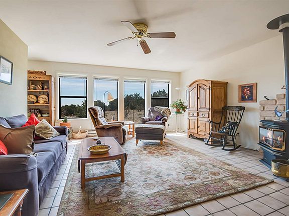 One owner home on 1.5 Acre Greenbelt lot. Classic Passive Solar Home. 3 Bed 2 Bath Tile floors. Solar panels on roof. Water catchment with cistern and 1/2 hp pump. Gas fire view heating stove. Shopping center, Senior Center, Community Center and Library located in the Eldorado Community.