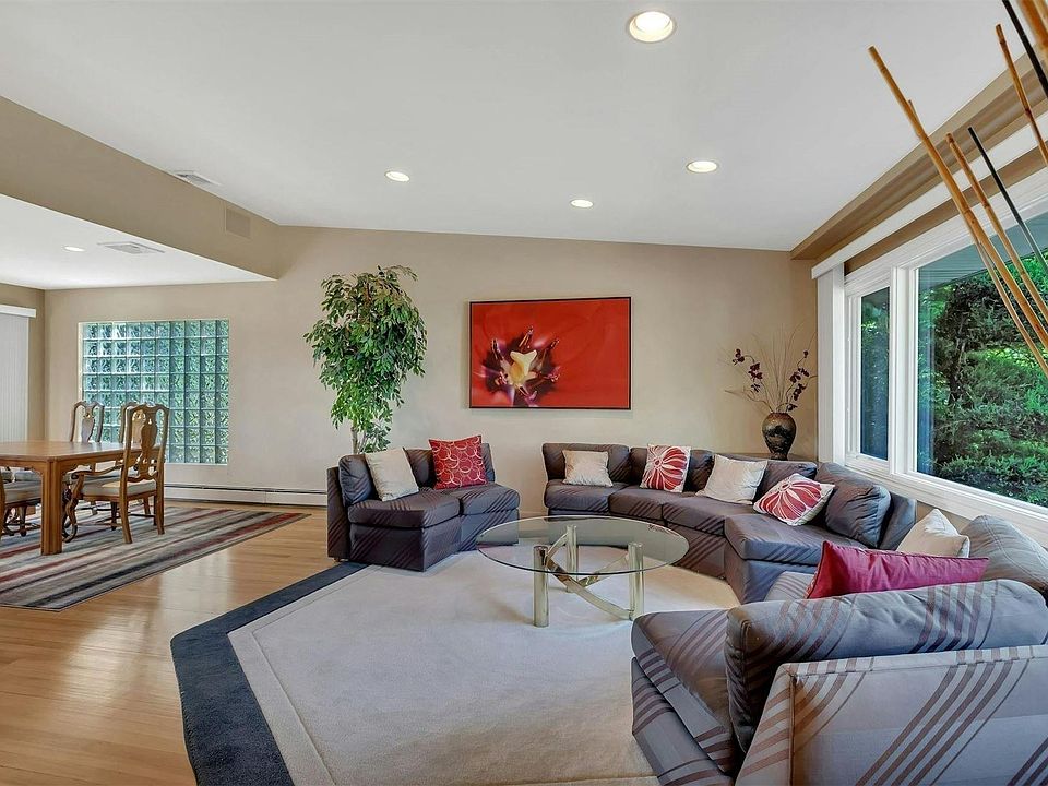 - Description: Entry, living room, dining room, open concept eat in kitchen with vaulted ceiling/skylight, sliders to deck