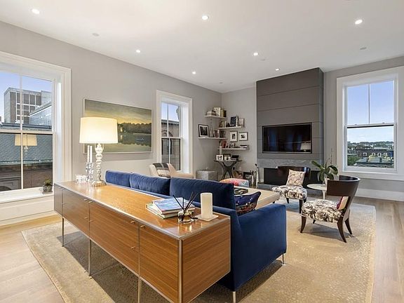Thoughtfully designed, this exquisite floor-through condominium offers windows on 3 sides and features the finest detail and comforts throughout. Direct elevator access welcomes you into a spacious entry foyer with built-in storage and a powder room. The first living space boasts a stunning chef's kitchen with an oversized island with seating, Caesar stone countertops, sleek, modern cabinetry, and a walk-in pantry. A casual sitting area features built-ins and wine storage and seamlessly opens to an expansive deck with endless views of of the Back Bay and beyond - perfectly suited for entertaining or unwinding after a long day. The main living area includes a formal living room with gas fireplace, dining, and a dry bar. Quarter sawn white oak in living areas. The master suite is outfitted with an oversized walk-in closet, custom built-in storage, and a gleaming marble bathroom. Additional amenities include W/D in-unit, two-car tandem garage parking, bike storage, storage, and a pet spa.