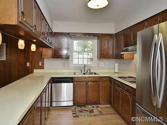 Nice N. Asheville neighborhood.Home sits high above street. You can walk through woods and over a low ridge to UNCA or via city streets to Beaver lake. Really nice hardwood floors,updated baths,large MBR for a mid century ranch,two fireplaces,extra large double garage,fenced back yard.Gas heat plus HP.Pending taking backups