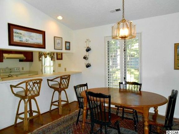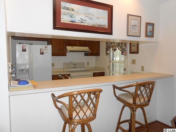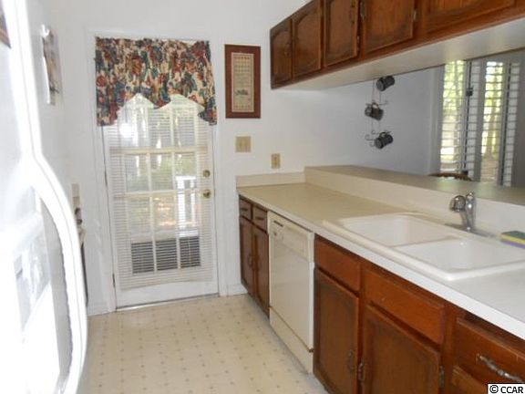 Nestled in the shade bordering the golf course this cute little patio home offers lots of living space!! Huge Carolina room across the rear of the home is perfect spot for afternoon conversation and relaxation after that hard day on the beach or golf course. The home has 2 bedrooms with a bath off the front hall and the MBR off the back with en-suite bath and sliders to the Carolina Room. The Living room has a high ceiling with a couple of steps down from the dining area. There is a Fireplace with ceramic logs on the outside wall and sliders to the Carolina Room also. An adorable deck is off the Kitchen for those outdoor BBQ's. The compact Kitchen has a pass-through and breakfast counter into the dining area. Pretty wood floors in dining room, living room and hallways. Carolina Shores offers pool, tennis, clubhouse and picnic area for reasonable fees. The location is outstanding for quick access to beaches, shopping, golf and Myrtle Beach. Easy to see.