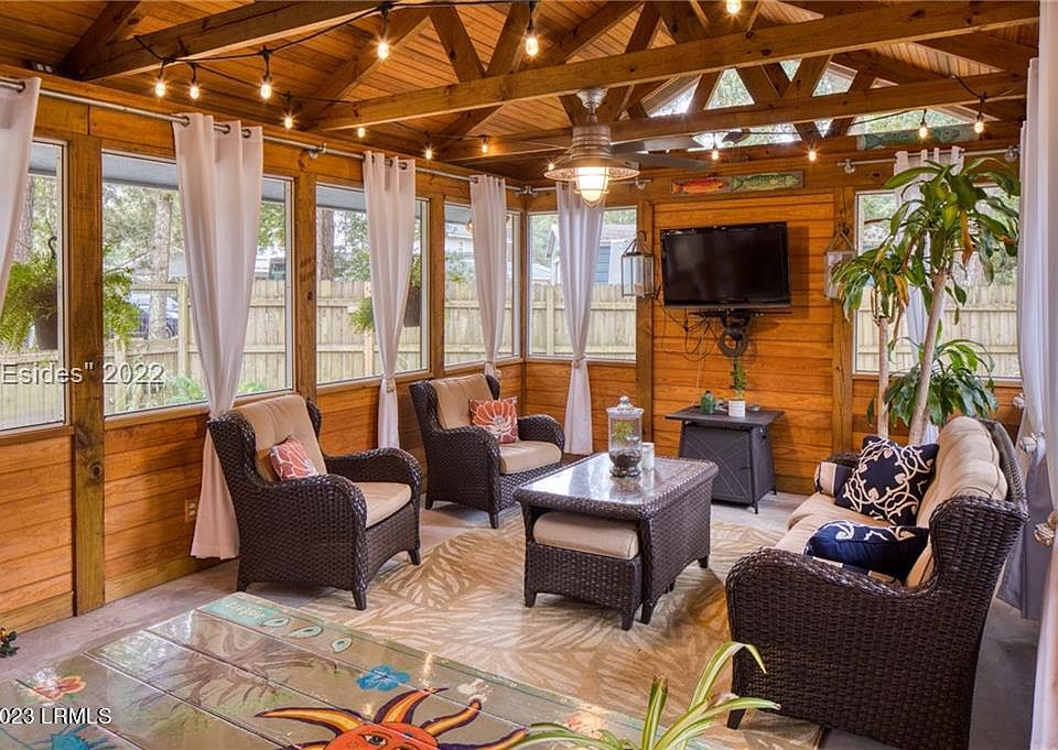 Private Resort Feel-You must see this stunning screened back porch with exposed beams, party lights and a swing bed overlooking the, hard to find, park like, fenced, 1 acre estate. This 2400 sq ft retreat has been lovingly renovated to include a breathtaking 2022 master bath spa - no expense was spared. So much to list - new quartz countertops, paint/carpet/tile, interior doors/ trim, 2021 roof, replaced windows, added 2 french doors and gas stove. There is a mother in law suite with an add'l room that can be transformed into a separate living/kitchen area with it own entrance. Minutes to Bluffton, Hilton Head & Savannah. Warranty. No POA!