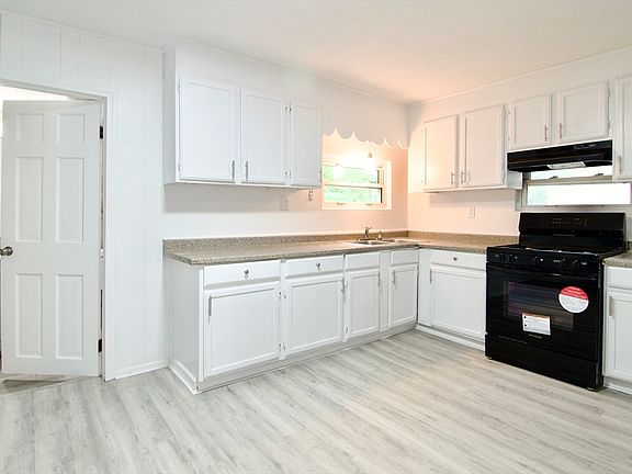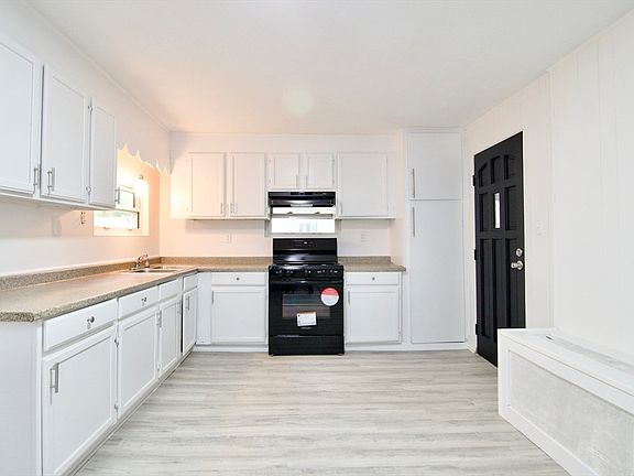 At this price, this will not last! Three spacious bedrooms, one and a half baths, big eat in kitchen with white cabinets and vinyl flooring. Enclosed front porch, vinyl windows and 1 car detached garage. Covered porch leads to backyard. Schedule your showing today!