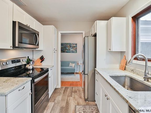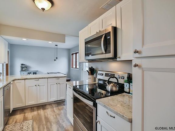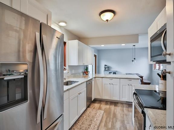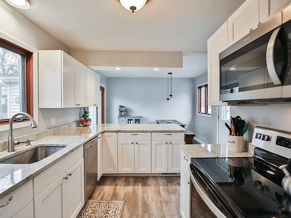 MULTIPLE OFFERS. ALL OFFERS DUE 5PM, SUN 11/23! Welcome to this beautiful ranch in the heart of Delmar. Set on a quiet street, yet walking distance to Four Corners' shops and restaurants, farmers' market, schools and more. Just steps to the Albany County Rail Trail for walking, biking, cross country skiing! You will fall in love with the brand new eat-in kitchen with granite countertop and backsplash as well as stainless steel appliances. Cozy up in the spacious and bright family room with bay window and new hardwood floors. Great floor plan with 3-4 bedrooms and two full bathrooms. Peace of mind with newer Lennox furnace, 200 amp electric, new main waterline, new gutters, and more. Exterior features a wonderful deck overlooking the fenced-in yard with a new fire pit and shed (sold as-is).