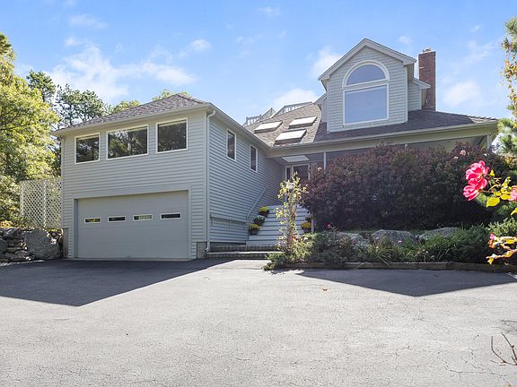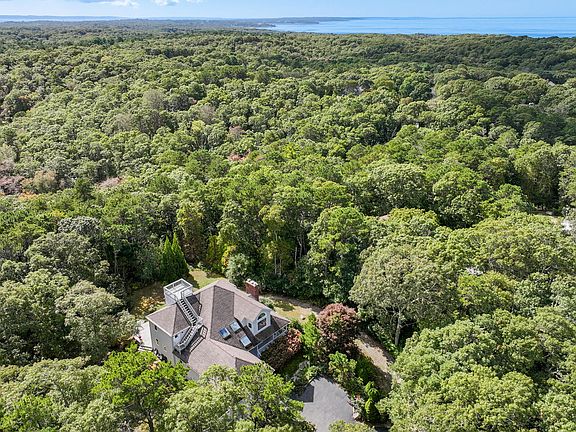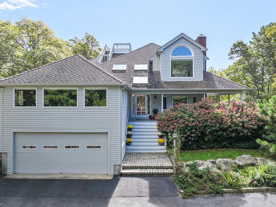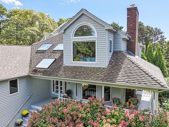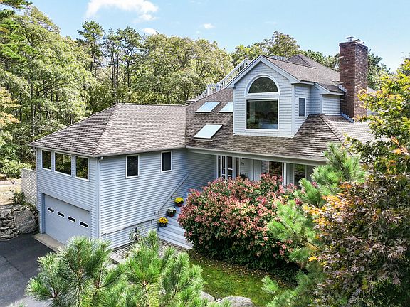 Elegant open floor plan contemporary in desirable Sippewissett Highlands! Nestled in a private wooded setting on a cul-de-sac abutting the conservation trails of Beebe Woods containing over 350 acres of gorgeous walking trails. Walk into this stately home that offers peace and privacy with walls of glass to bring the outside in. House features a wrap around covered porch and backyard deck with areas for gardens or bigger playground areas. The home features a curving staircase at the entry foyer and a step down fireplaced living room, office, dining area open to the country kitchen. There is a separate enormous family room above the two-car garage, glistening hardwood floors, second floor primary suite with wood burning fireplace, jacuzzi tub for soaking in, and Juliet deck and very large walk in closet, three additional bedrooms, winding staircase, and widow's walk to enjoy the views of nature. Very large walkout basement with extensive storage. Deeded association beach rights and close to downtown and the Shining Sea bike path.