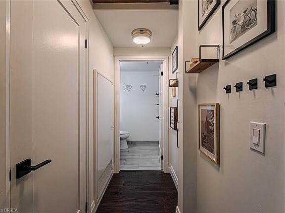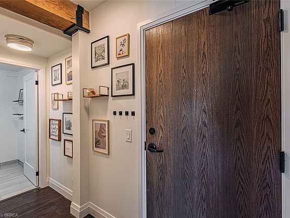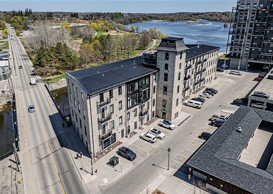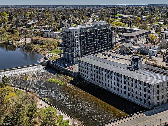 Introducing this stunning 2-Storey Condo in the Riverbank Lofts Building located in the Historic Downtown Hespeler! Experience the perfect blend of modern luxury and historic charm, set in a beautiful historical building conversion right along the scenic Speed River. The building was developed in 1847 by Jacob Hespeler, and used as a mill, distillery, and even a plumbing factory before being converted into a luxury condominium apartment building. Once inside this home; you will be captivated by soaring ceilings, huge oversized windows that flood the space with natural light, original wood beams and gorgeous hardwood floors throughout the main living spaces. Enjoy cozy evenings in the living area featuring a custom built-in entertainment centre with an electric fireplace with amazing views of the river just outside the windows. The custom designed eat in kitchen is complemented with upgraded appliances, quartz countertop's; and a hidden pantry cleverly tucked beneath the stairs, offering both beauty and functionality. Juliette balconies add a touch of European elegance through out, while a convenient 2-piece powder room on the main level is perfect for guests. Up the beautiful staircase you will find the unique catwalk which connects the two spacious bedrooms, each boasting its own private ensuite bathroom and stylish sliding barn doors, along with the convince of the bedroom level laundry. The Primary bedroom; again a custom one-of-a-kind design, offers built in side tables, sound dampening curtains, and flawlessly designed walk in closet; while the second bedroom offers a built in storage and desk system, along with its own private bathroom. Offering 2 parking spots, amenities include 3 common lounges, fitness centre, bike storage room with dog wash station; all within this secure building. This home is steps away from the boutiques, cafés, parks and river views of downtown Hespeler Village, offering the ultimate urban lifestyle in a picturesque riverside setting.