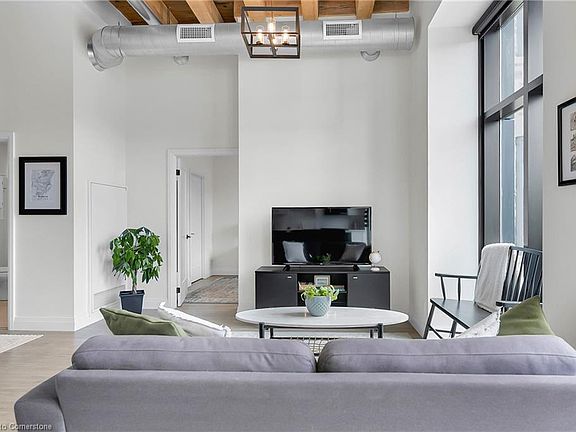 Welcome to 19 Guelph Street in the heart of Hespeler Village, where history, charm, and modern living come together. This one-bedroom, one-bathroom unit is tucked inside a beautifully restored heritage building—Riverbank Lofts, a boutique building with just 42 units. With soaring 14-foot ceilings and exposed beams, the space feels open, airy, and full of character you just don’t find in a typical condo. It’s also one of only two units in the entire building that features floor-to-ceiling windows, flooding the space with natural light during the day and custom blinds for privacy and comfort at night. The open-concept layout is warm and inviting, with a smart floor plan that makes the most of every square inch. You’ll love the private balcony for your morning coffee or evening glass of wine, and the thoughtful finishes throughout add a polished, welcoming feel. The unit also comes with a storage locker for added convenience. Riverbank Lofts offers a fitness centre, resident lounge, pet wash station, and bike storage and you’re just steps from the river, trails, shops, and cafés. This is Hespeler living at its best.